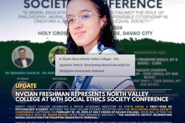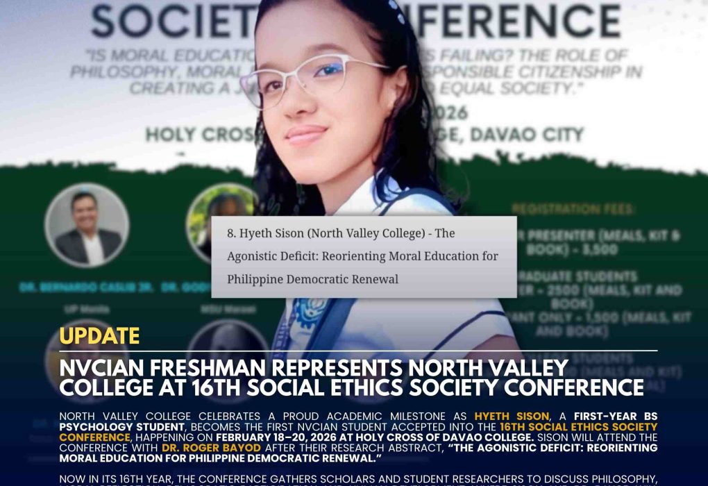 2 days ago2 days ago NVCian Freshman Hyeth Sison, a first-year BS Psychology student Represents North Valley College at 16th Social Ethics Society Conference