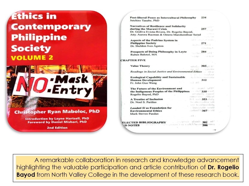 The North Valley College Foundation, Inc. (NVCFI) continues to make its mark in international academic collaboration through the exemplary work of its Research and Publication Director, Dr. Rogelio P. Bayod. His active engagement with international scholars and institutions has led to several co-authored research articles and a major contribution to the textbook โEthics in Contemporary Philippine Society.โ