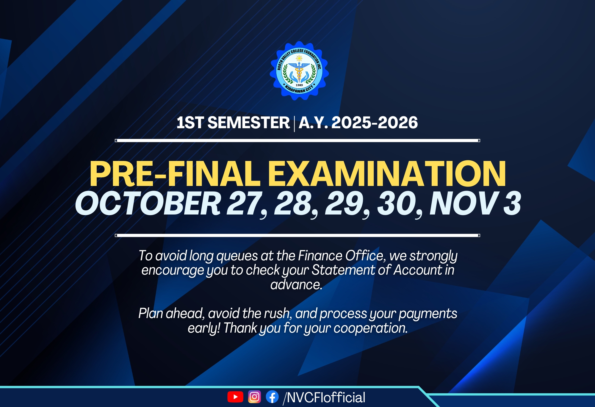 AnnouncementsPREFINAL EXAMINATION (1st Semester A.Y. 2025-2026) 1 mins Spread the love BS_NURSING_EXAM_SCHEDULE-1st-Year-4th-YearDownload BS-RADIOLOGIC-TECHNOLOGY-EXAM-SCHEDULE-1st-Year-3rd-YearDownload BS-MEDTECH-EXAM-SCHEDULE-1st-Year-3rd-YearDownload BS-PHARMACY-EXAM-SCHEDULE-1st-Year-3rd-YearDownload BS-PSYCH-EXAM-SCHEDULE-1st-Year-4th-YearDownload BS-SOCIAL-WORK-EXAM-SCHEDULE-1st-Year-3rd-YearDownload BS_IT_EXAM_SCHEDULE-1st-Year-4th-YearDownload BS-INFORMATION-SYSTEM-EXAM-SCHEDULE-1st-Year-4th-YearDownload BS-COMPUTER-SCIENCE-EXAM-SCHDULE-1st-Year-4th-YearDownload BTVTED-EXAM-SCHEDULE-1st-Year-3rd-YearDownload BS-OFFICE-ADMINISTRATION-EXAM-SCHEDULE-1st-YearDownload BS-TOURISM-MANAGEMENT-EXAM-SCHEDULE-1st-YearDownload Post navigation Previous: NVC BUILDS STRONGER COMMUNITIES ON ITS 35TH FOUNDATION DAY CELEBRATIONNext: A FOUNDATION OF KNOWLEDGE: STUDENT LEADERS CHAMPION QUALITY EDUCATION Leave a Reply Cancel replyYour email address will not be published. Required fields are marked *Comment * Name * Email * Website Save my name, email, and website in this browser for the next time I comment.