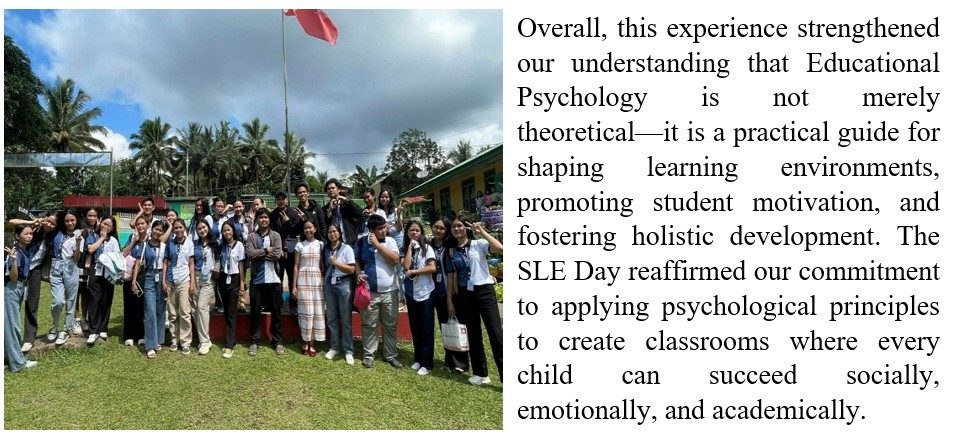 Participating in the SLE Day 2025 outreach provided a valuable opportunity to bridge theoretical knowledge with real-life practice. Working directly with the 183 elementary students allowed us to observe firsthand how developmental principles manifest in actual group settings. Concepts such as emotional regulation, social learning, and cooperative play became more concrete as we facilitated activities that targeted these skills.