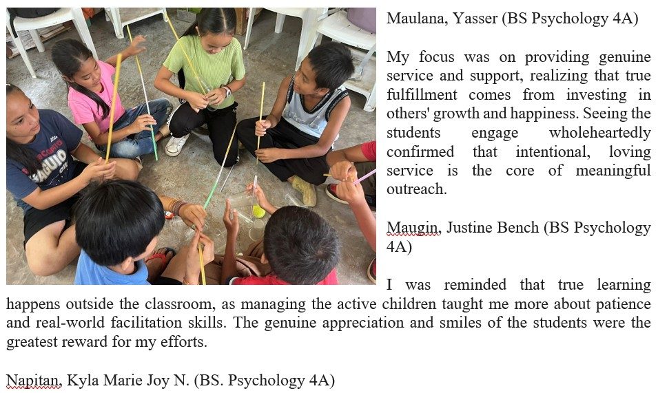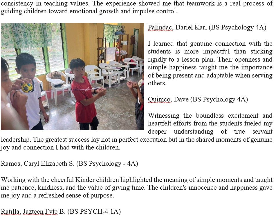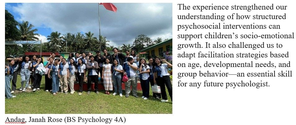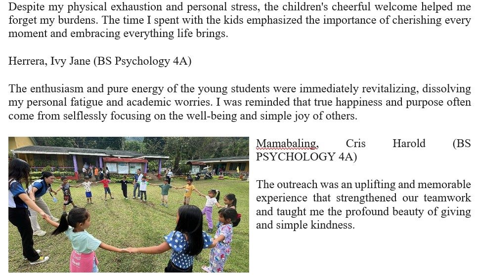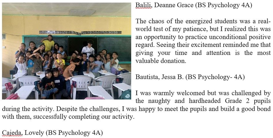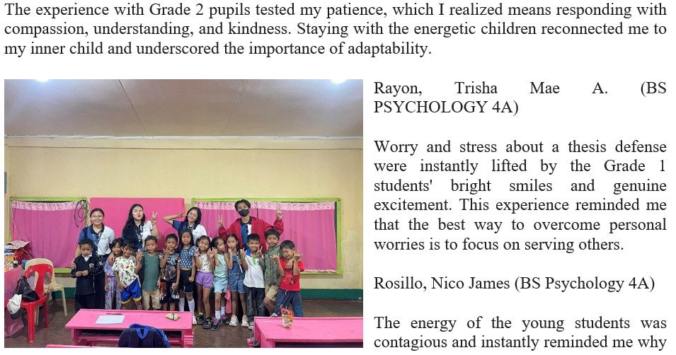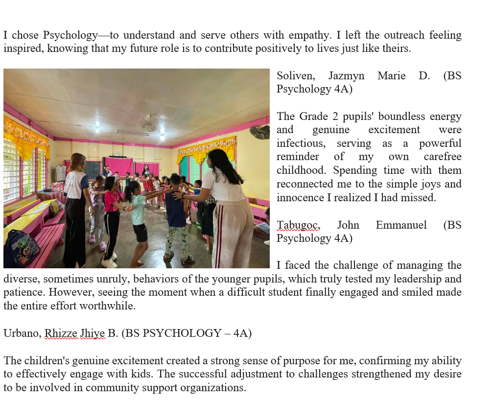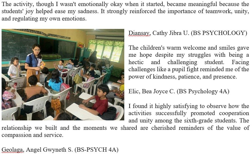 The deep satisfaction came from providing tangible support and seeing the students’ faces light up with hope and gratitude. I was reminded that being a Psychology student means extending genuine care beyond the classroom, especially to those who need encouragement the most.
